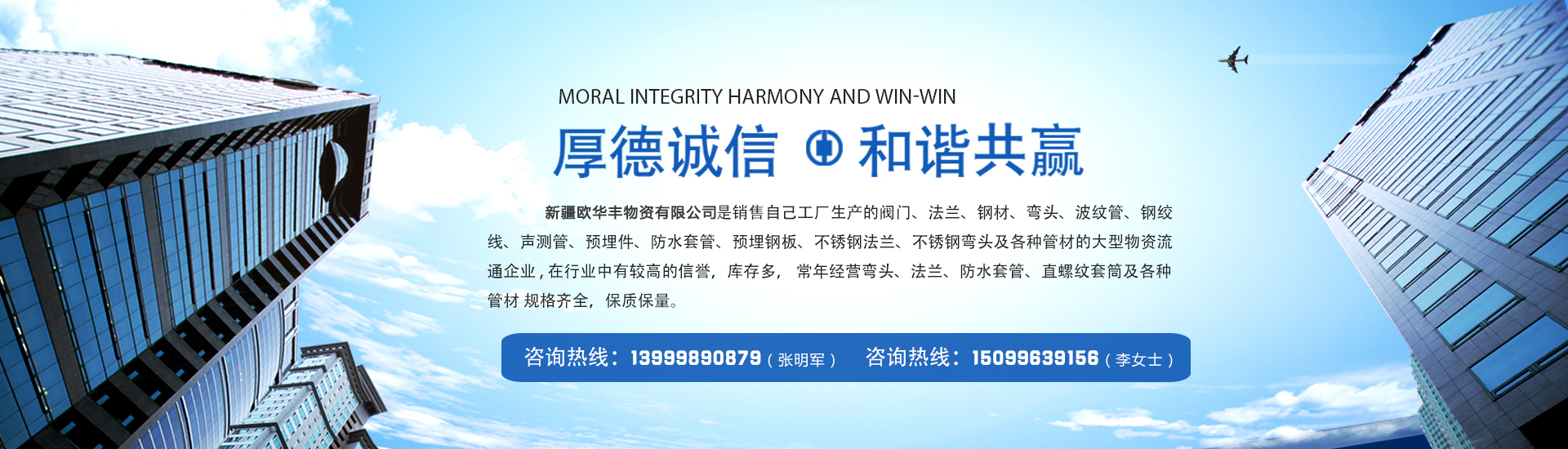 新疆歐華豐物資有限公司是銷(xiāo)售自己工廠(chǎng)生產(chǎn)的彎頭  法蘭  防水套管  及各種管材的大型物資流通企業(yè) , 在行業(yè)中有較高的信譽(yù),庫(kù)存多,常年經(jīng)營(yíng)閥門(mén)、法蘭、鋼材、彎頭、波紋管、鋼絞線(xiàn)、聲測(cè)管、預(yù)埋件、防水套管、預(yù)埋鋼板、不銹鋼法蘭、不銹鋼彎頭及各種管材 規(guī)格齊全,保質(zhì)保量。 公司一貫以: 服務(wù)上乘、質(zhì)量?jī)?yōu)質(zhì)、價(jià)格合理、客戶(hù)至上、服務(wù)周到、讓利客戶(hù)、薄利多銷(xiāo)為原則,誠(chéng)實(shí)守...